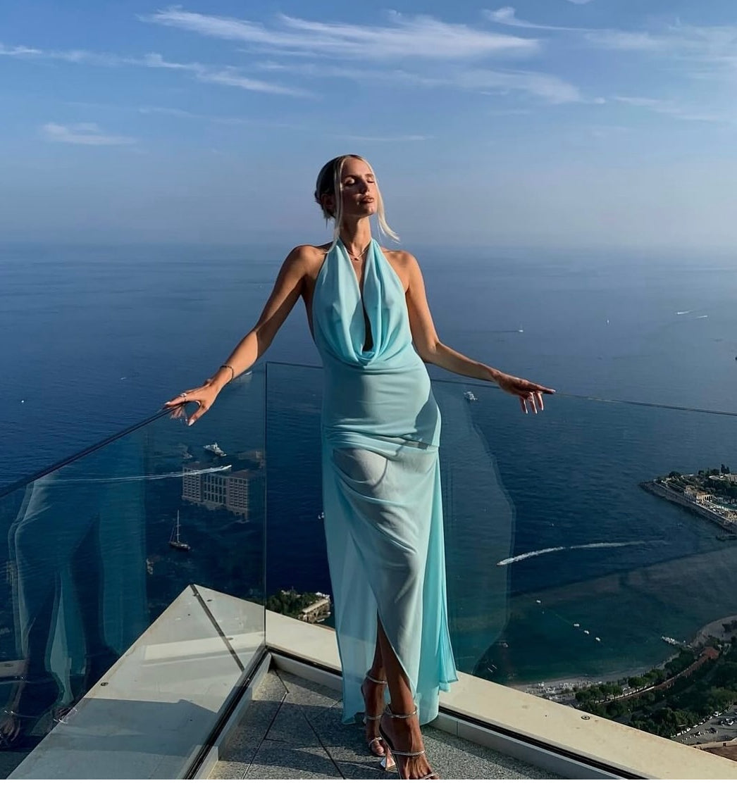 The Anastasia can be worn with a shorter hemline or embraced at her full-length alter ego. Soft Georgette drapes fluidly from a halter neckline, falling into a deep cowl front. Adjustable cord tie sits underneath the bust to secure the drape to the bodice and support an exaggerated open back. Considered in wearability, Anastasia's self-lined front and wrapped back feature create playful coverage.
