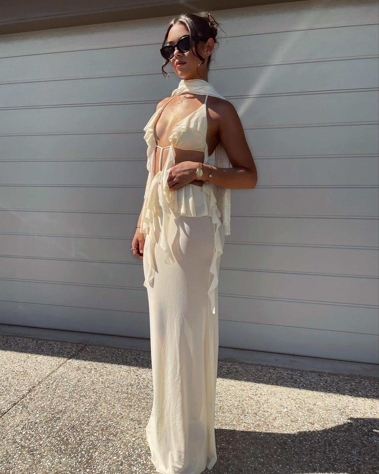 Alluring edged in playful, Ariel features a full length skirt connected to a triangle crop. Cascading mesh elegantly drapes from the centre-bust and sides. An angled waistline and dipped back feature follow the shape of the feminine silhouette, enhanced by thoughtfully placed ruffles. Playful ruffle coverage continues along the top edge of the bust to balance sheer, soft-stretch mesh.