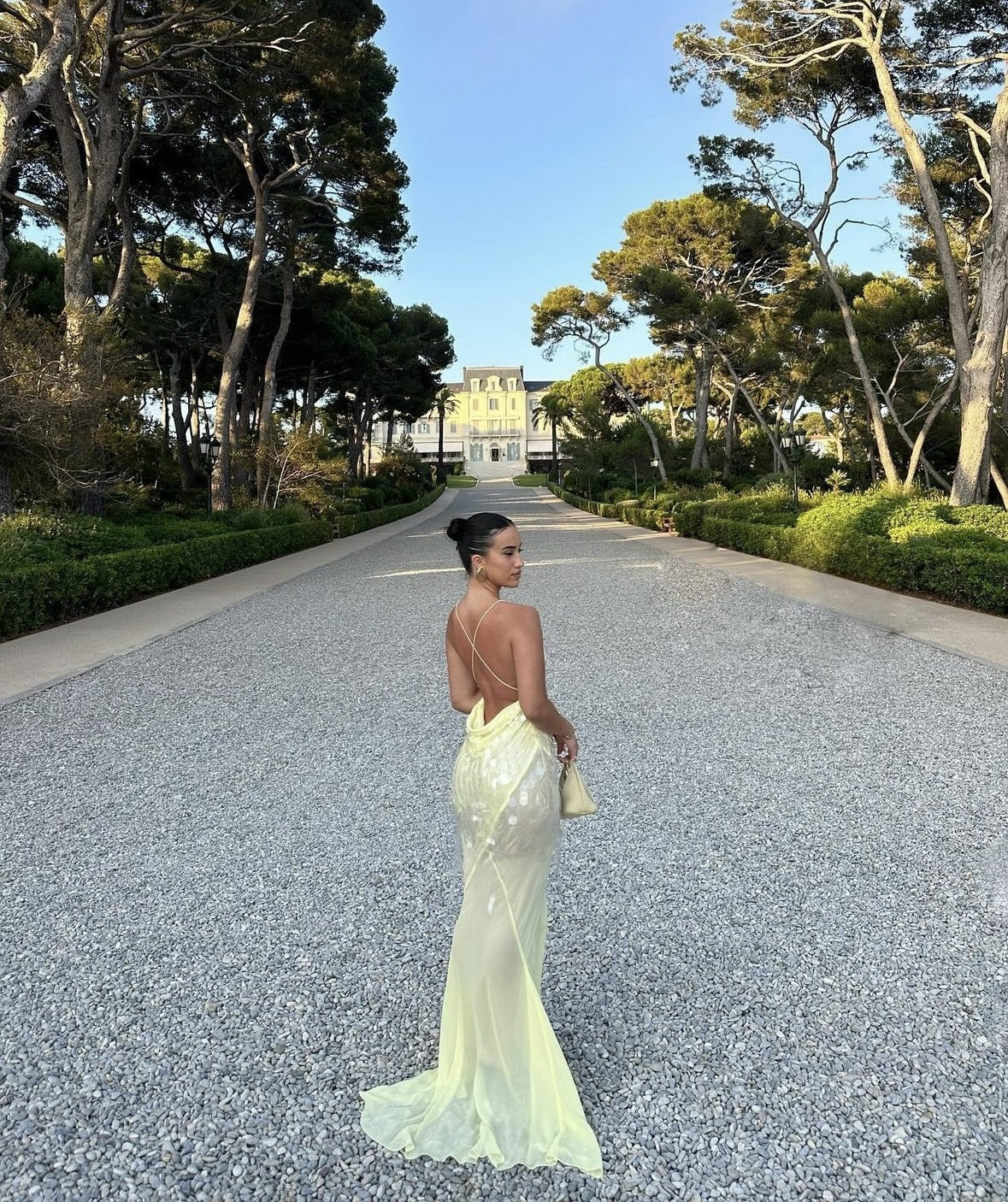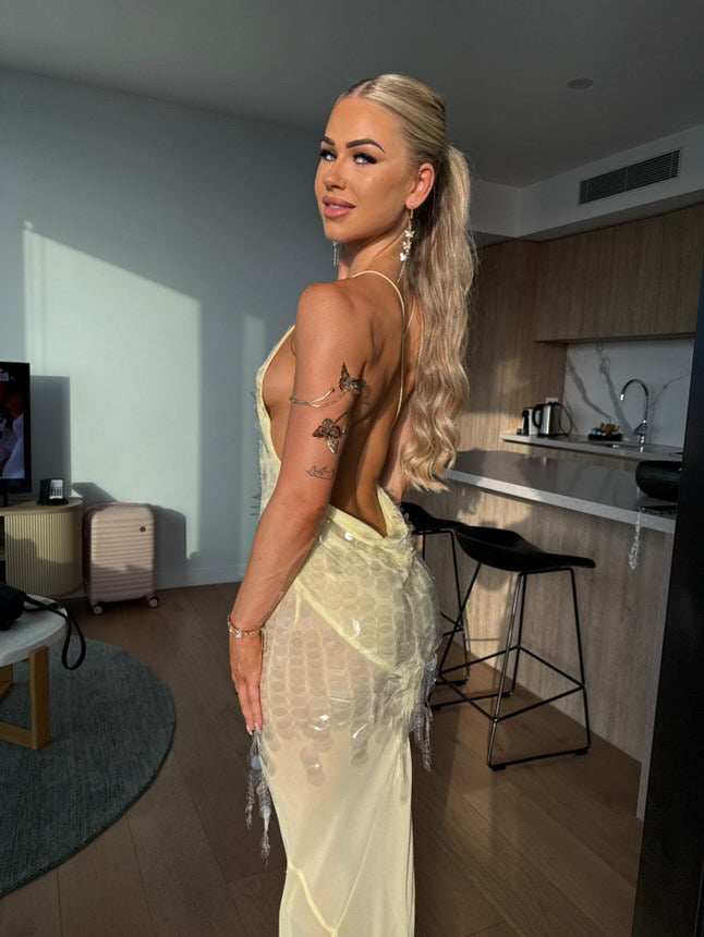 Handmade in India from sherbert lemon silk georgette and dripping in thousands of sheer sequins that shimmer from head to toe, she’s truly one of a kind and totally unforgettable.