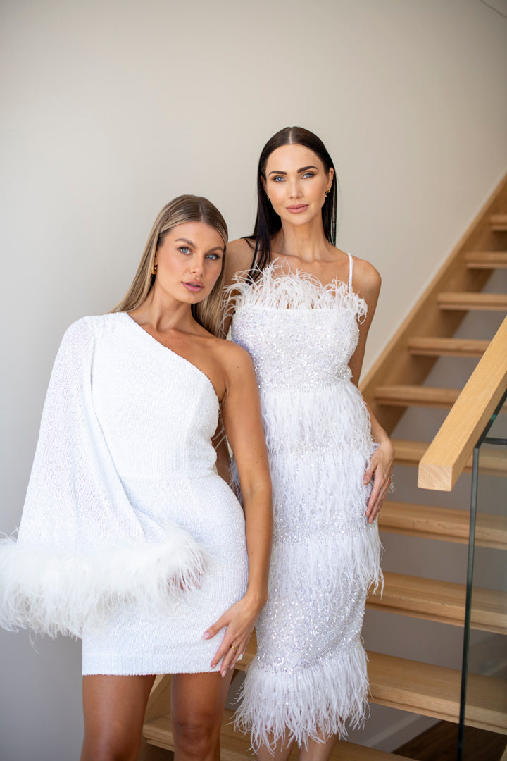 The Davina One Sleeve Mini Dress was crafted in a light-reflecting sequin fabrication, designed with a fitted bodice connecting to an A-line mini skirt. It features ostrich feathers at the cuff of the sleeve and is finished with a zipper fastening at the side.